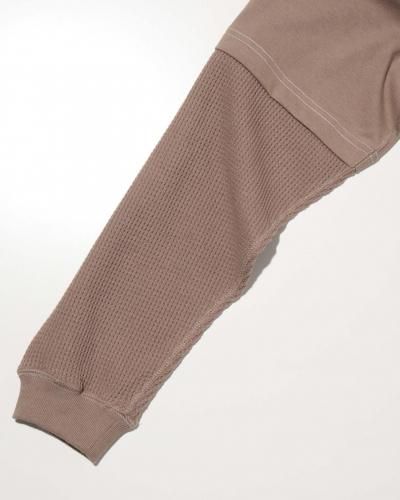 ドライタッチの天竺生地にハニカムサーマルを重ねたフェイクレイヤードTシャツ。